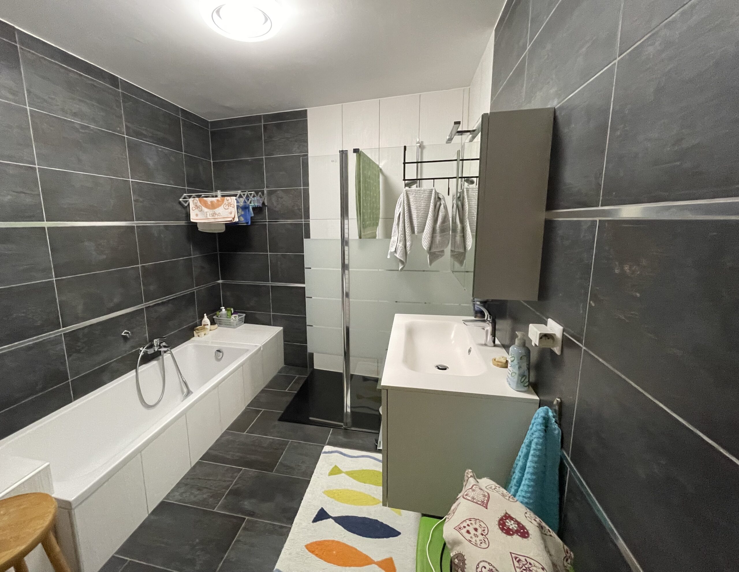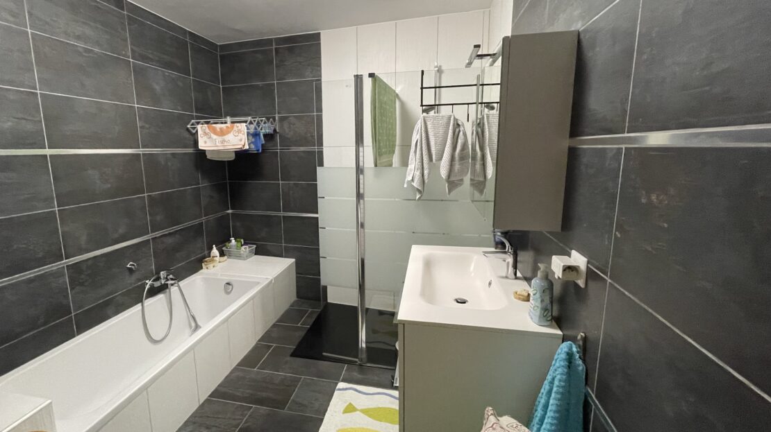 – une salle de bain toute carrelée avec douche + baignoire